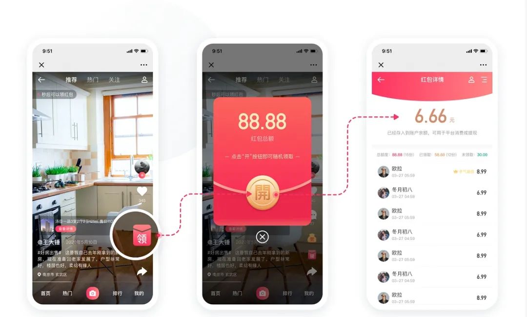 有紅包的視頻,在播放完成后即可領到紅包,領紅包必須登錄會員且必須關注作者,紅包功能既可以促進視頻的完整播放觀看,又可以為作者增加粉絲量;紅包以平臺余額的形式打入到用戶的賬號中,也可以申請?zhí)岈F(xiàn)到微信零錢中
